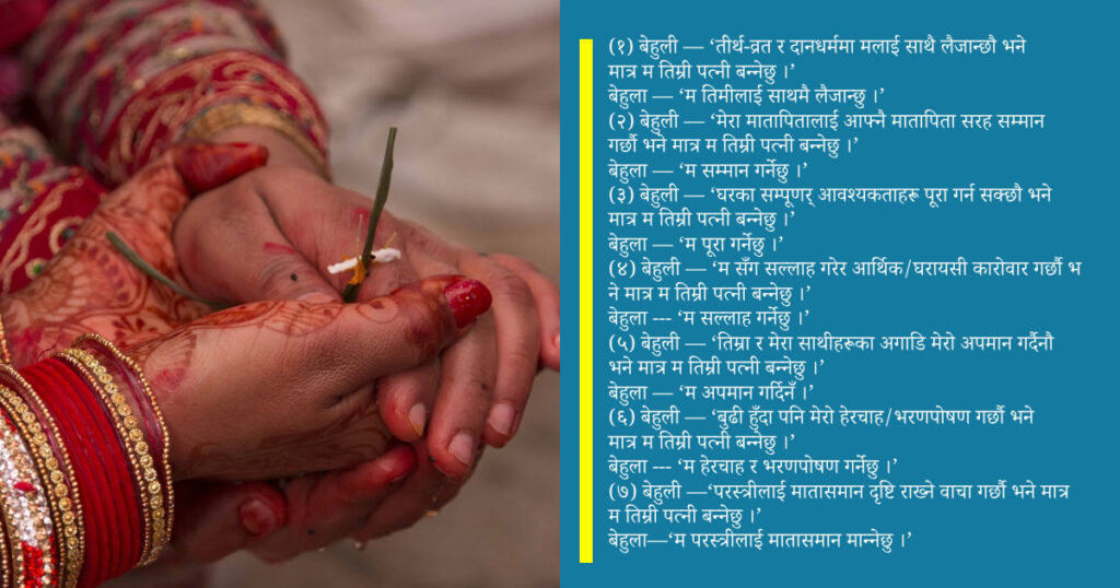 (४) बेहुली — ‘म सँग सल्लाह गरेर आर्थिक/घरायसी कारोवार गर्छौ भने मात्र म तिम्री पत्नी बन्नेछु ।’