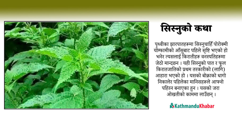 पृथ्वीका झारपातहरूमा सिस्नुचाहिँ पोरोक्मी योम्फामीको आँसुबाट पहिले सृष्टि भएको हो भनेर त्यसलाई किरातीहरू वनस्पतिहरूमा जेठो मान्दछन । यही सिस्नृुको पात र फूल किरातजातिको प्रथम तरकारीको (लागि) आहारा भएको हो । यसको बोक्राको धागो निकालेर पहिलेका मानिसहरूले आफ्नो पहिरन बनाएका हुन । यसको जरा ओखतीको काममा लाउँछन् ।