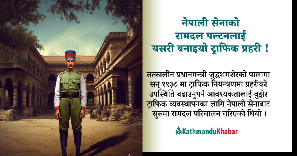 काठमाडौं । अहिले सवारी साधन व्यवस्थापनको लागि खटाइएका ट्राफिक प्रहरीहरू नेपाल प्रहरीको एउटा महाशाखा अन्तर्गत रहन्छन । तर यसको इतिहासलाई हेर्ने हो भने यो नेपाली सेनाको एउटा पल्टनबाट सुरु भएको पाइन्छ। सन १८५७ मा अंग्रेजले गोर्खा रेजिमेन्टको सहयोग लिएरै भारतको सिपाही विद्रोह दबाएको थियो। त्यो विद्रोह दबाउन रैफल, कालीबस्क, नयाँ गोरख, गोरखनाथ, श्रीनाथ, बर्जबहादुर, सूर्यदल, कालीबहादुर, देवीदत्त, नरसिंहदल, जबरजंग, गणेशदल, भैरवनाथ, पुरानो गोरख, कालीप्रसाद, सिंहनाथ, शमशेरदल, रामदल, महेन्द्रदल, राजदल, शेरपल्टन, जंगनाथ, सबुज, बरख र कालीजंग पल्टनका सेना खटिएका थिए।
