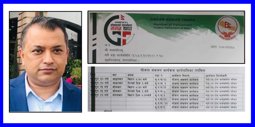 संसाद गगन थापाद्वारा हस्ताक्षरित पत्रमा योजना संकलन गरिने कार्यक्रममा अनिवार्यरूपमा अग्रज समाजसेवी, बुद्धिजिवी, पेशाकर्मी, वडा समितिका पदाधिकारी तथा टोल समितिका सभापति उपस्थिति रहनु पर्ने पनि सांसद कार्यालयको पत्रमा उल्लेख गरिएको छ ।