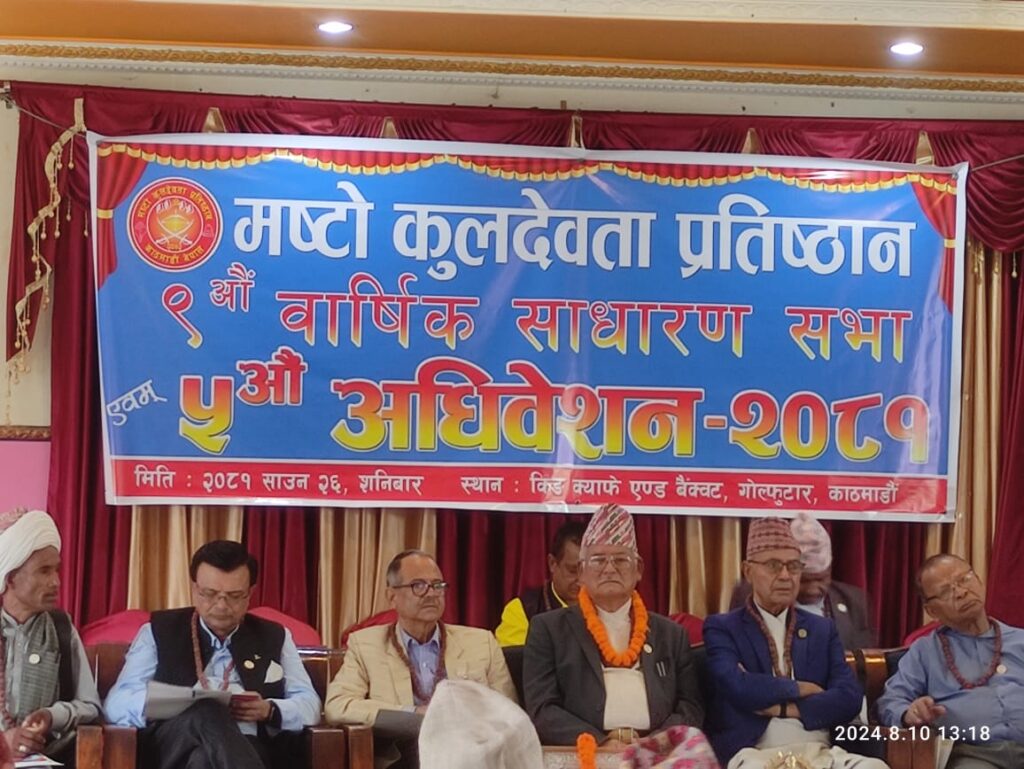 काठमाडौं । मष्टो कुल देवता प्रतिष्ठानको नवौं साधारणसभा एवं पाँचौँ सम्पन्न भएको छ । शनिबार काठमाडौंको गोल्फुटारमा रहेको किङ क्याफे एण्ड बैंङ्क्विटमा आयोजित एक कार्यक्रमकाबीच प्रतिष्ठानको साधारणसभाको उद्घाटन सत्र सम्पन्न भएको हो ।