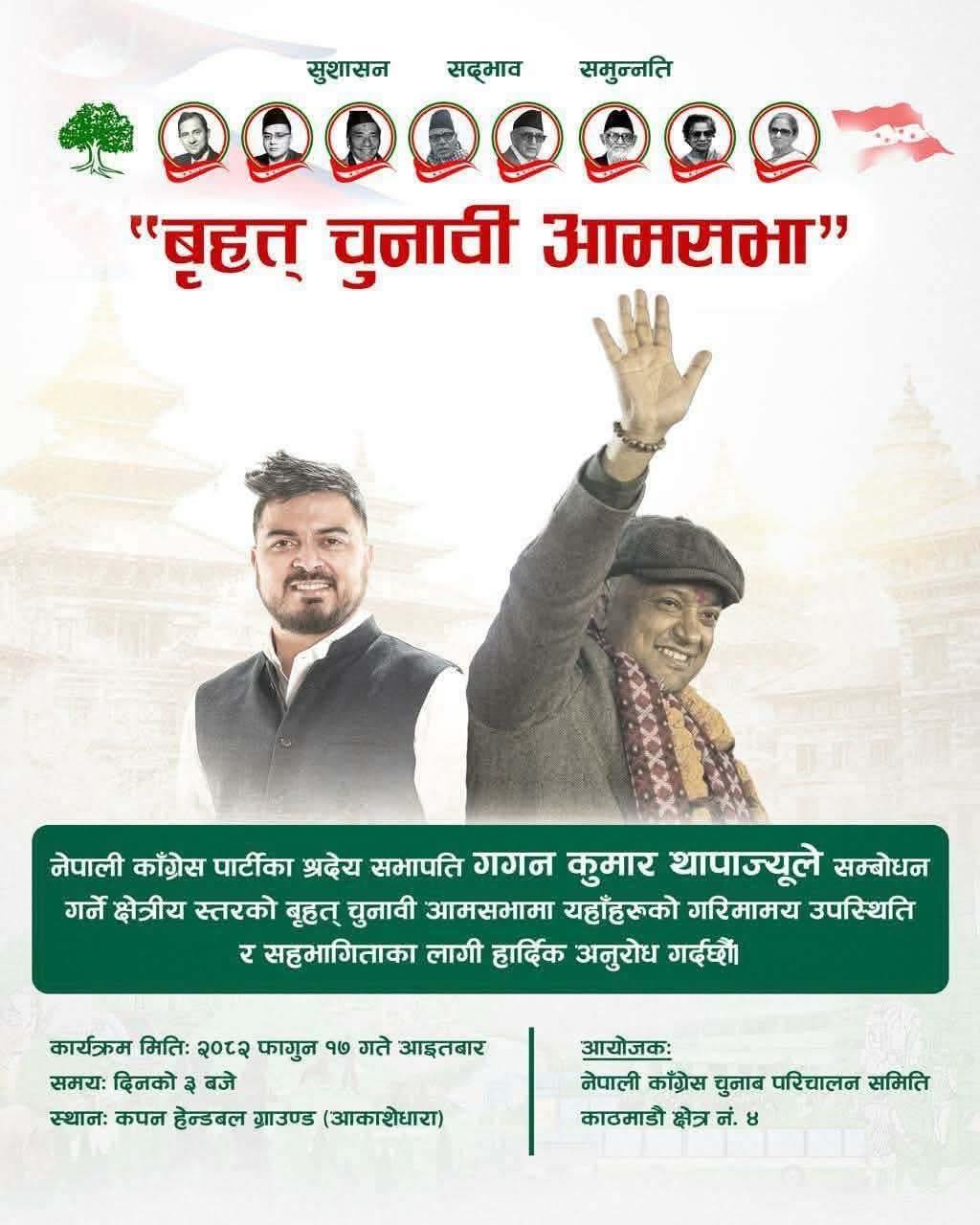 काठमाडौं । नेपाली कांग्रेसले आइतबार (२०८२ फागुन १७ गते) काठमाडौं उपत्यकाका विभिन्न स्थानमा ६ वटा चुनावी सभा आयोजना गर्ने भएको छ। सभाहरूमा पार्टी सभापति गगनकुमार थापा, उपसभापति विश्वप्रकाश शर्मा र प्रवक्ता देवराज चालिसेले सम्बोधन गर्ने कार्यक्रम रहेको निर्वाचन प्रचारप्रसार समितिले जनाएको छ।